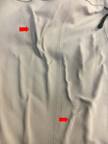 こちらのウェアも経年劣化の現れです。多年数を経過したウェアをクリーニングした結果です。ウェアの生地は何層かに分かれています。その中間層の生地が断裂した状態となります。白い部分に確認できます。